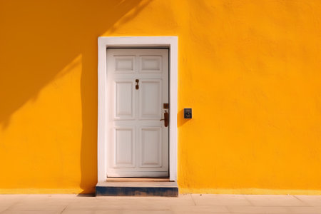Yellow wall and white door in Santorini island, Greece.
