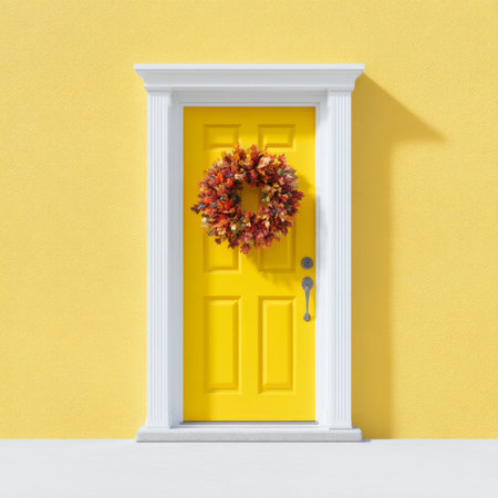A vibrant yellow door adorned with an autumn wreath stands against a matching yellow wall, creating a cheerful and warm entrance full of seasonal charm.
