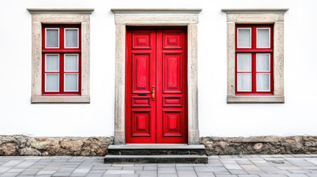 A striking red door set against a pristine white wall, featuring elegant windows and stone accents. This image captures modern architectural beauty.