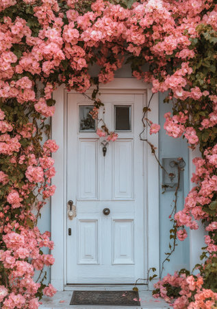 A white door framed by vibrant pink flowers creates a picturesque view. This charming setup showcases the beauty of nature in a serene outdoor environment during spring.