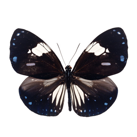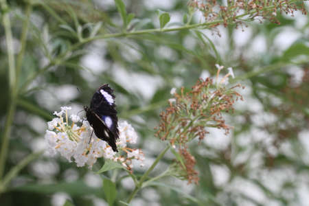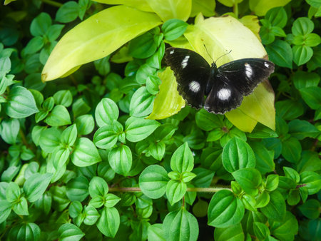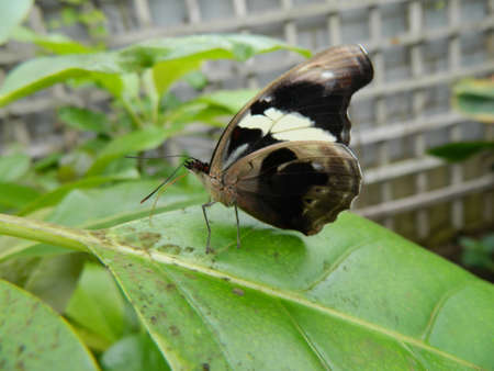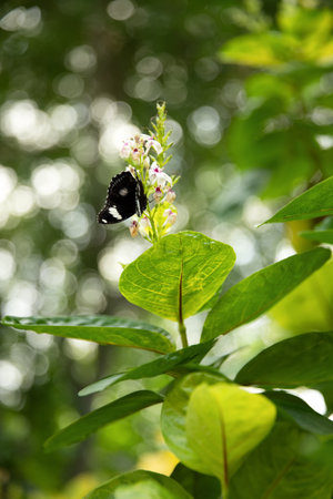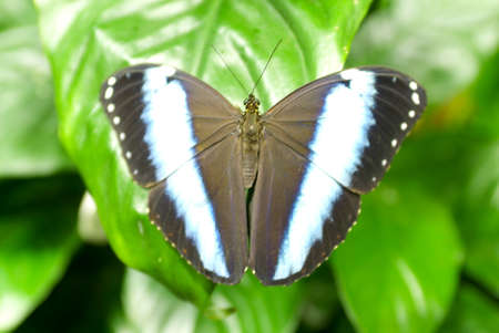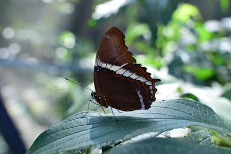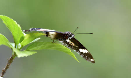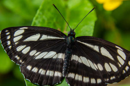 Black and white picture of a noble tropical butterfly on green nature background on big tropical island Ilha Grande in Angra dos Reis Rio de Janeiro Brazil.