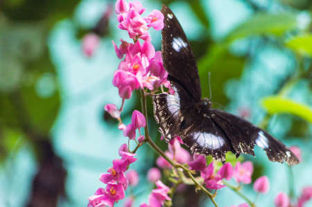 Exotic butterfly feeding on a colorful flower. Shot in low ambient light in the amazonian forest.