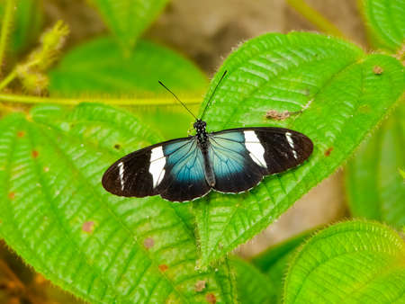 Sara Longwing (Heliconius sara) butterfly resting on leaves with proboscis extended