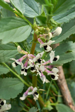 In spring, broad bean plants - Vicia faba - bloom in orchards.