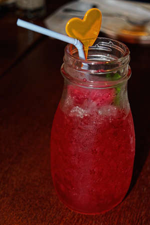 A bottle of raspberry lemonade on a wooden table in a restaurant