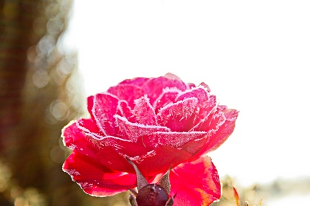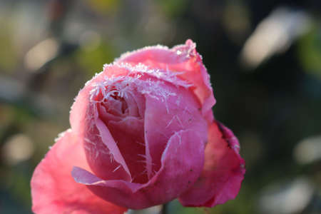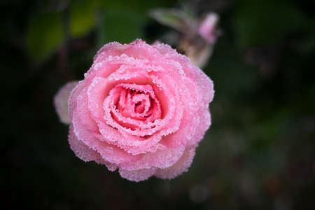Frost on pink rose flower in the garden on winter season