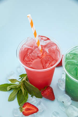 colored lemonades in plastic cups with ice, fruits and berries on a blue background