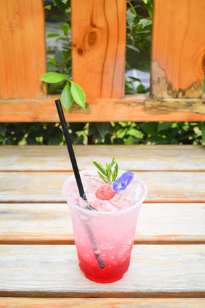 Strawberry Italian soda with butterfly pea flowers in plastic glass on wooden table.
