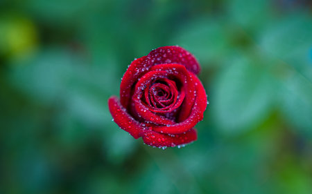 Beautiful red rose with dew drops on the petals in the garden