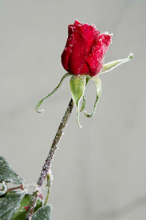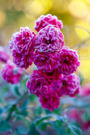 Frozen roses after night frost in autumn, toned nature background
