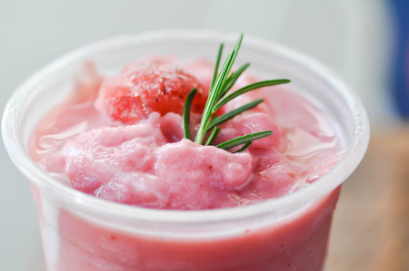 Closeup of watermelon smoothie drink in plastic glass on marble table, selective focus