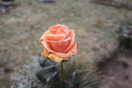 an orange rose flower is covered with ice crystals in winter