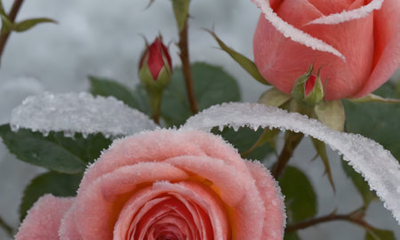 Close up of beautiful pink roses in the snow. Selective focus.