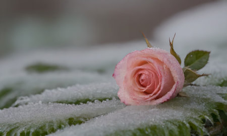 pink rose in the snow in winter, shallow depth of field