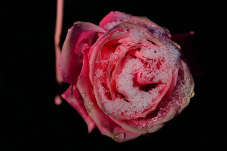 Close-up of a pink rose in winter with snow against dark background in cold weather