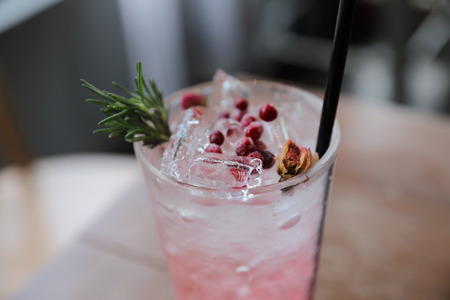 Pink cocktail with lychee syrup and sparkling soda decoration with rosemary cherries and slice lemon. Concept of homemade refreshment