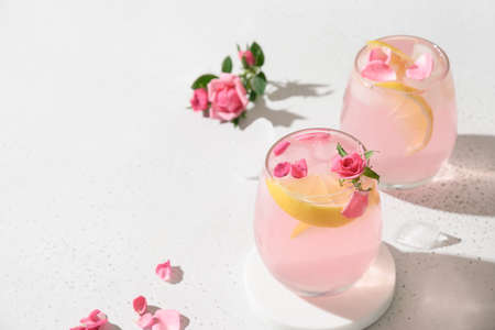 Pink rose cocktails, drinks or lemonade with rose flowers on white sunny background. Close up. Copy space.
