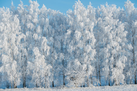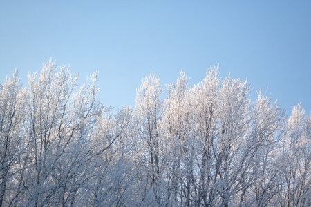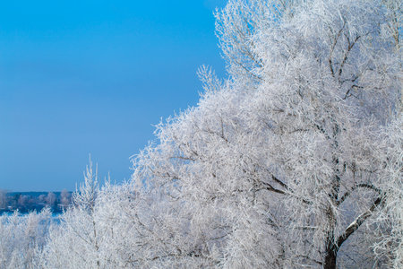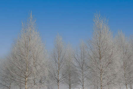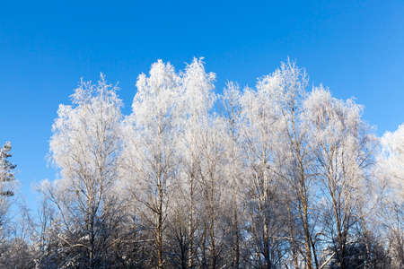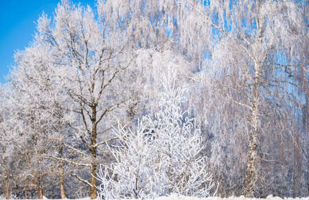 Winter trees with white rime. Natural beautiful background with hoarfrosted trees in winter.