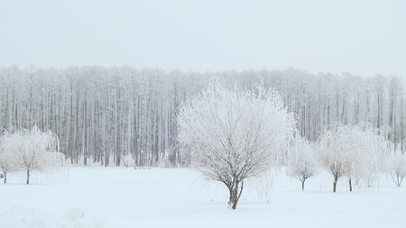 trees in frost and snow on a cold winter day