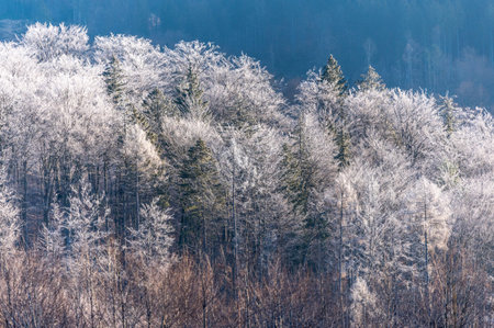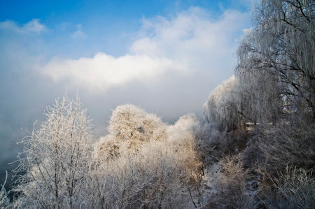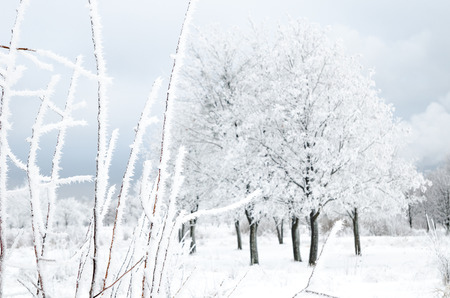 Cold winter day, beautiful hoarfrost and rime on trees