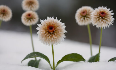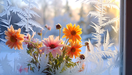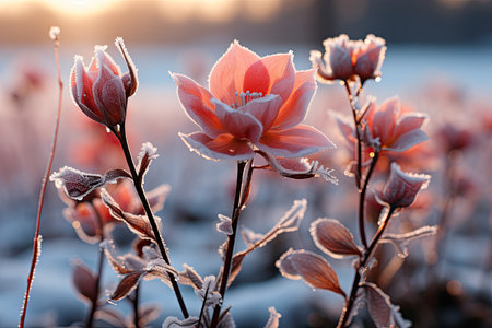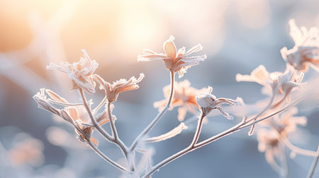 A Delicate flowers covered in frost sparkle under the soft light of a winter morning.
