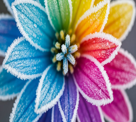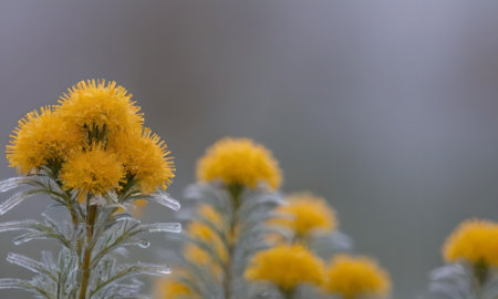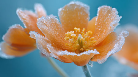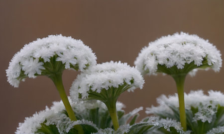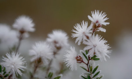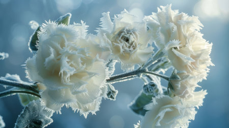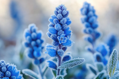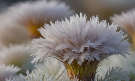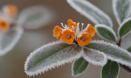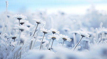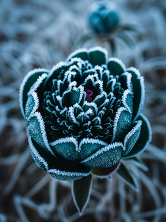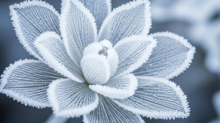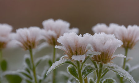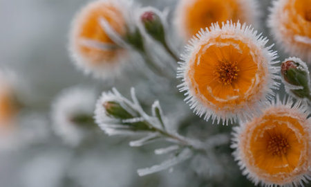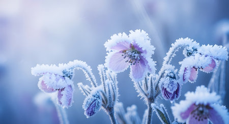 Close-up of beautiful frost-kissed flowers with intricate ice crystals, showcasing nature's delicate beauty in a cold winter morning. Soft bokeh background enhances the serene atmosphere.