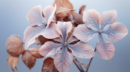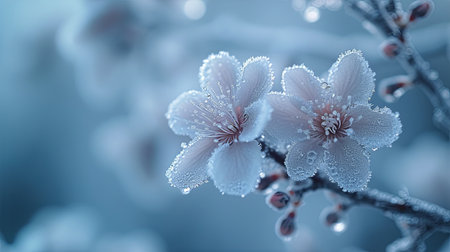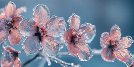 Frosted winter flowers delicate pale pink blooms covered in ice crystals, cool blue tones creating frosty atmosphere, winter season, floral details enhanced AI Generative AI generated