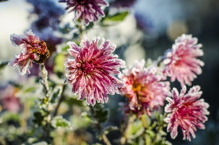 pink, burgundy chrysanthemums in the garden are covered with hoarfrost