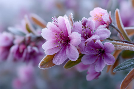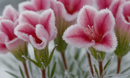 Delicate pink flowers covered in frost, showcasing winter resilience and beauty