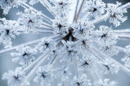 Delicate wild flowers covered in sharp ice crystals during a cold winter day