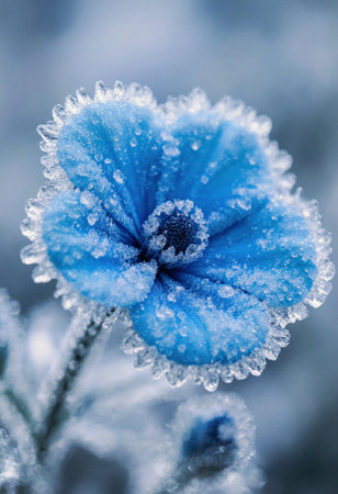 A close-up image of blue flowers adorned with delicate frost, showcasing intricate ice crystals on the petals. A stunning representation of winter's beauty.