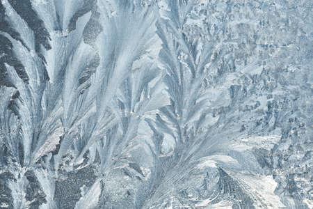 Ice patterns on winter window glass. Silver frozen ice texture. Abstract natural background.