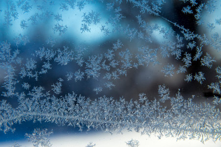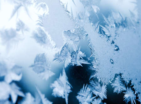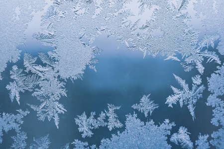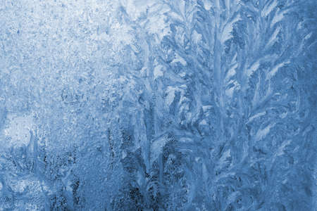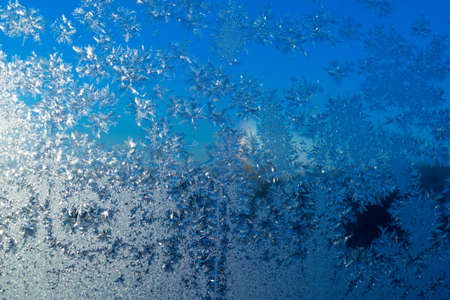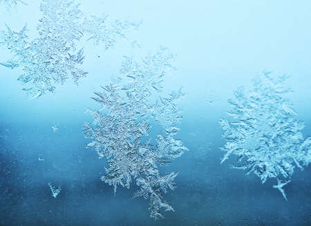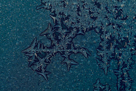 Blue background with frozen snowflakes on the glass. Frost on glass on a frosty morning. Christmas and new year.