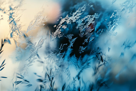 Delicate frost flowers decorate the glass, shimmering in soft morning light. A tranquil winter backdrop creates a peaceful atmosphere enhanced by the intricate ice designs.