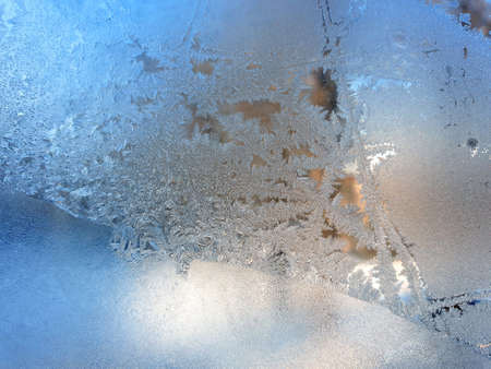 Frost And Sun on glass in winter. Blue Pattern ice on window
