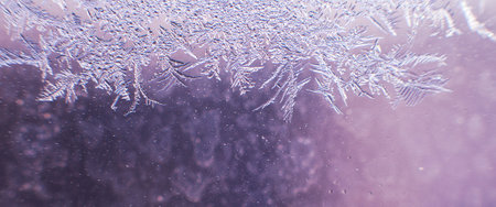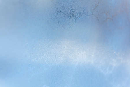 Winter background on a transparent glass of a window with a frozen texture. Abstract texture background, horizontal image, copy space for your design or text