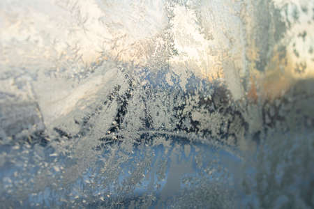 Frosty patterns on a winter window. Cold weather, Christmas mood