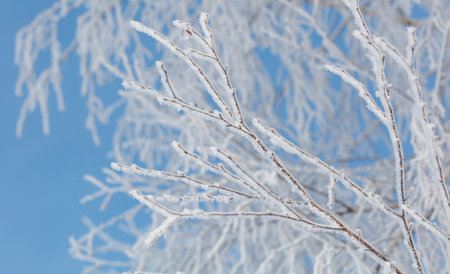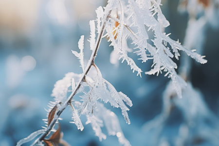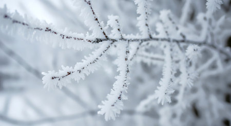 Frosty branches covered in delicate white ice crystals on a winter's day. concept of nature's beauty, chilling weather, seasonal change.