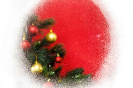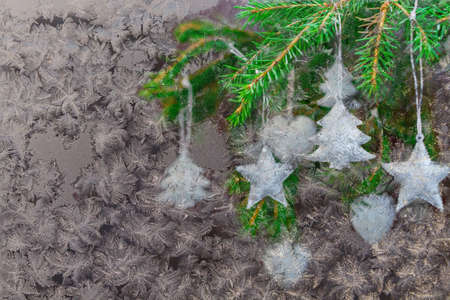 Christmas tree branch with Christmas decorations through a frozen window with hoarfrost