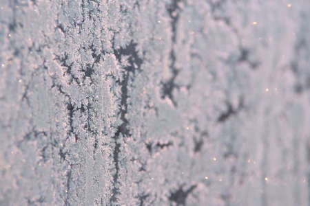 Beautiful winter background, frost on the window, natural texture on glass with a frozen pattern. Copy space, natural background, macro