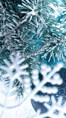 Christmas tree decoration with blue bauble and snowflakes on blurred background