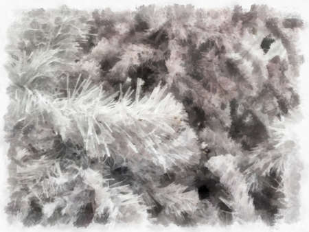 Close up of frosted pine branches covered with delicate snow and ice crystals, creating a serene winter wonderland scene with a beautiful, cold, and icy natural background
