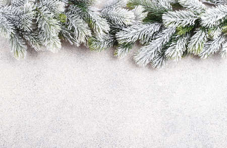 Banner winter background. Fir branches on gray background. Copy space.