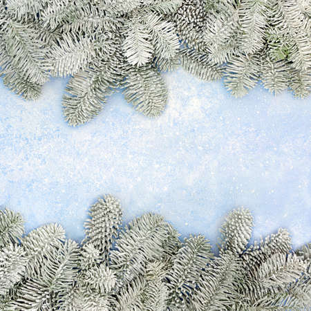 Winter Christmas and New Year snow covered spruce fir border on pastel blue background. Festive composition. Flat lay, top view, copy space.