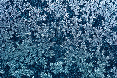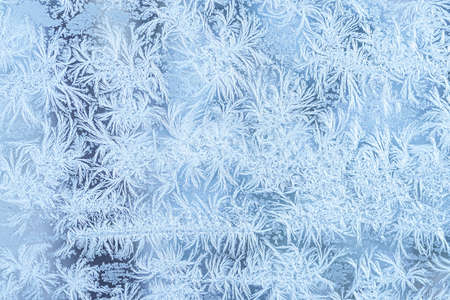 Blue frosty pattern on window glass, winter background