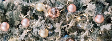 Balls and garlands hanging on pine branches on festive backdrop. Golden baubles on spruce tree. Christmas background. Merry Christmas and Happy New Year holiday postcard. Festive decoration pattern