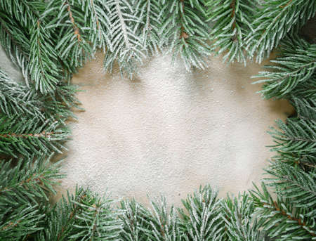 A beautiful arrangement of frosted evergreen branches creates a serene frame around a blank space, ideal for winter designs, holidays, and seasonal greetings.