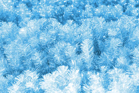 Christmas new year festive shiny colorful defocused background, festive decor, fir branches made of fluffy tinsel of blue silver color.
