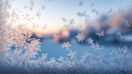 Frosty snowflakes glisten in the dawn light, forming an enchanting winter view filled with intricate crystal patterns and serene colors.