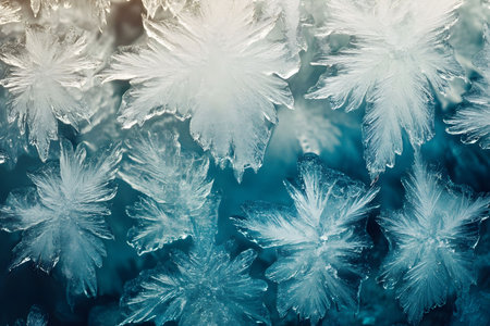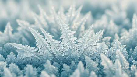 Detailed macro view of sharp ice crystals and frost patterns sparkling in the light